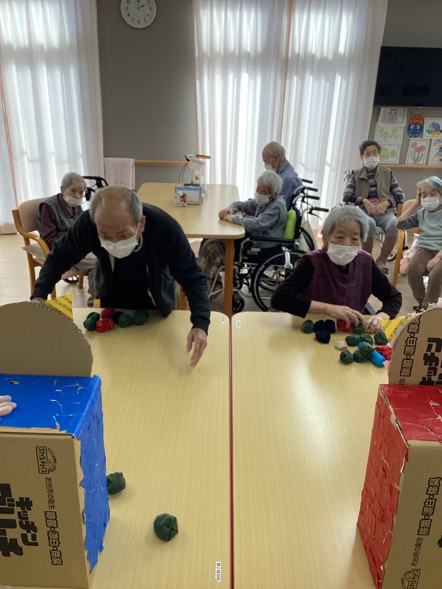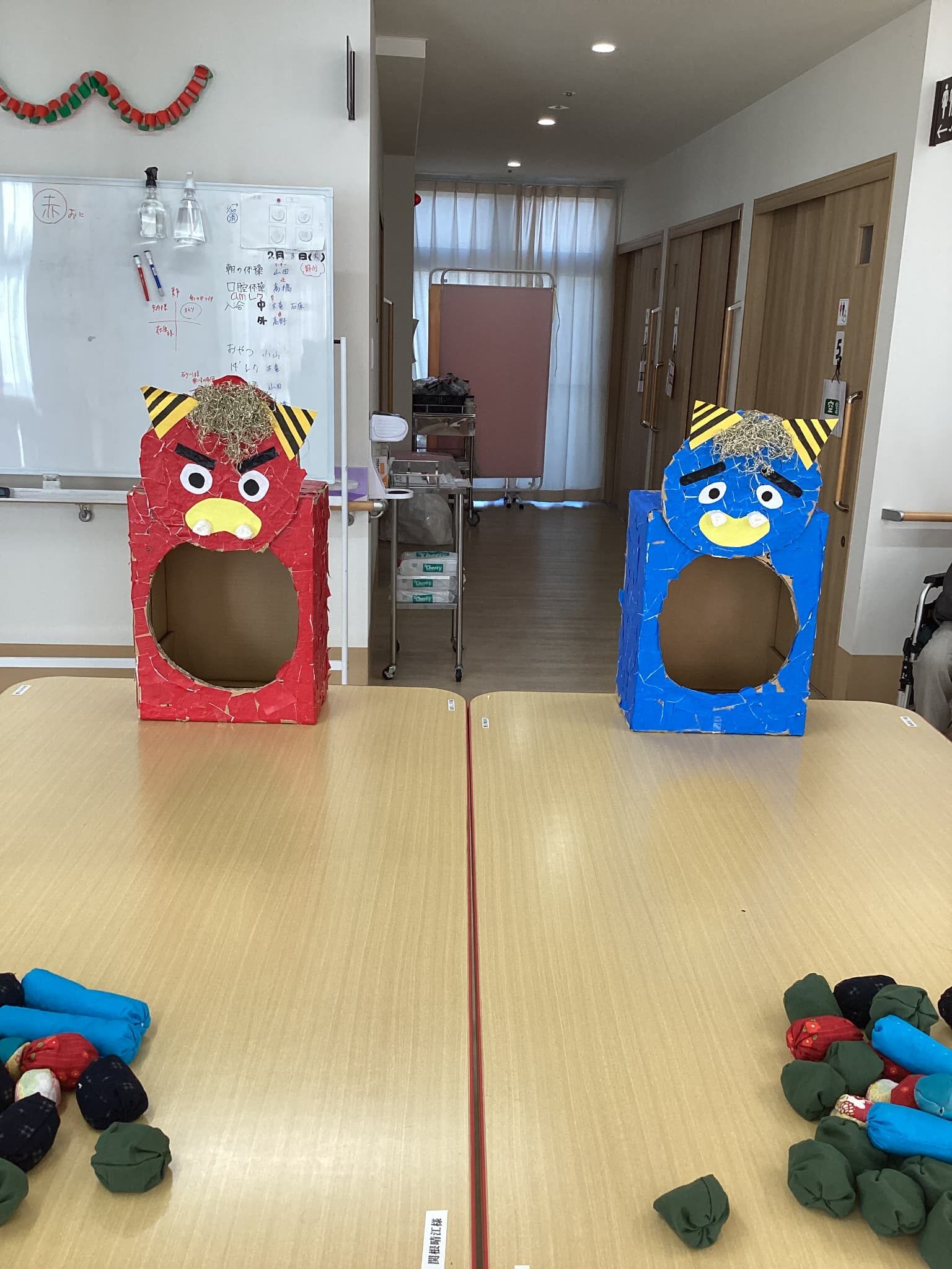 赤鬼と青鬼を作り一人々制作した鬼を目掛け鬼退治をおこないました(^^♪