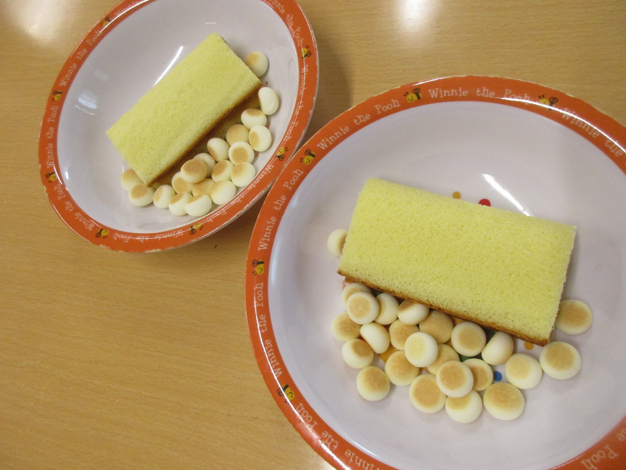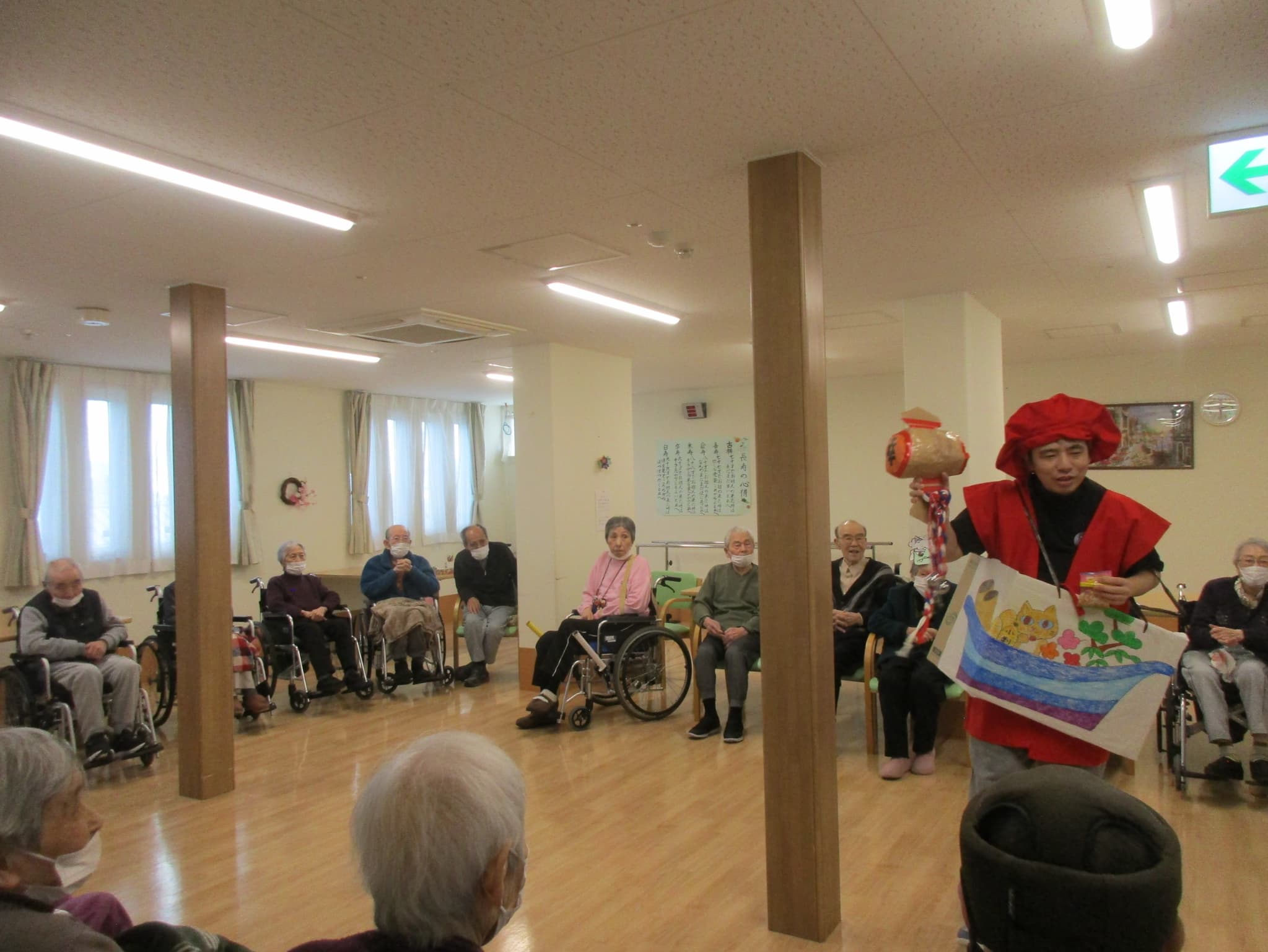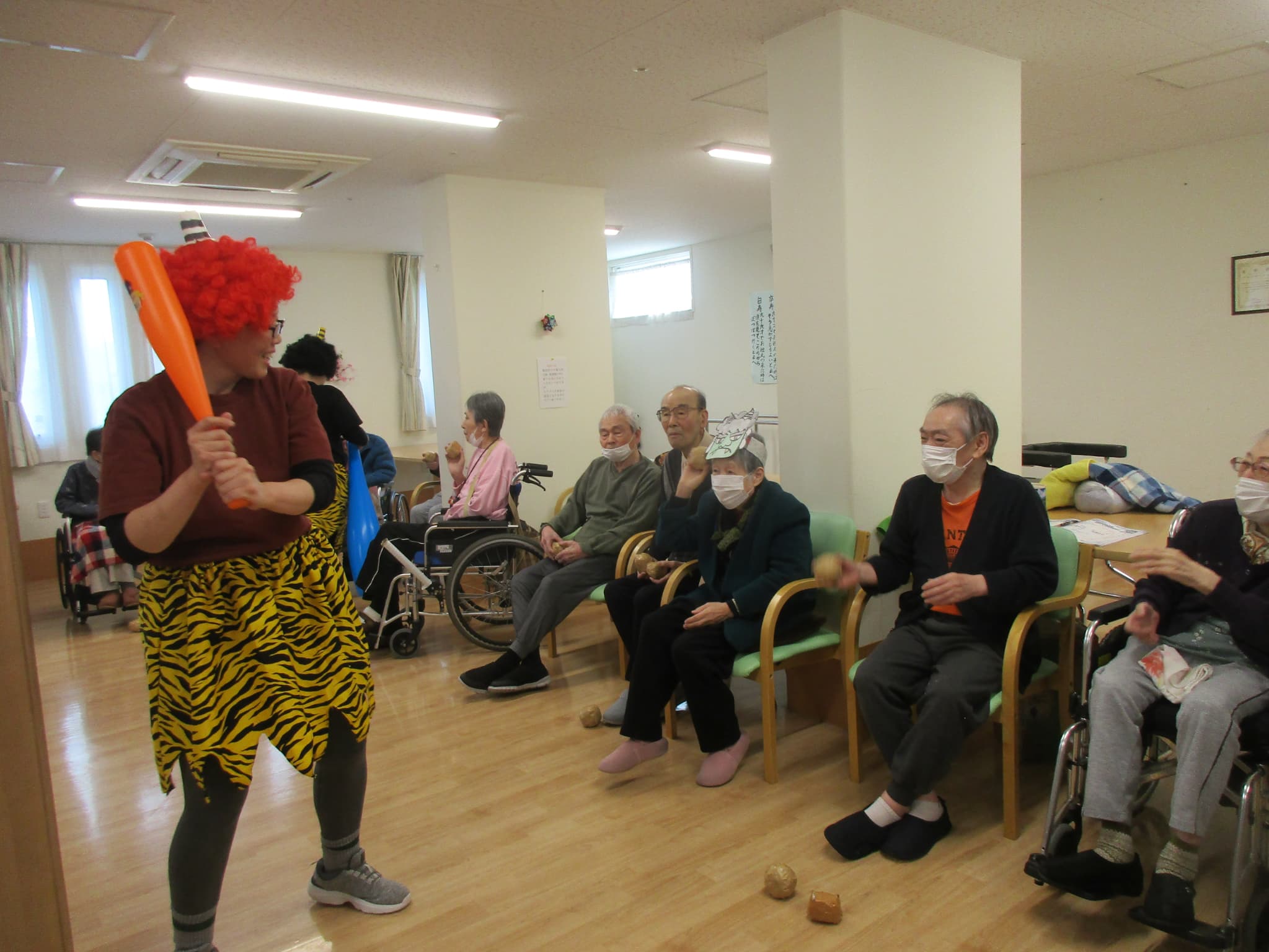 鬼や福の神が近くに寄ると「可愛い♡」と皆さん笑顔でした。おやつでは配ったたまごボーロを美味しく召し上がりました。