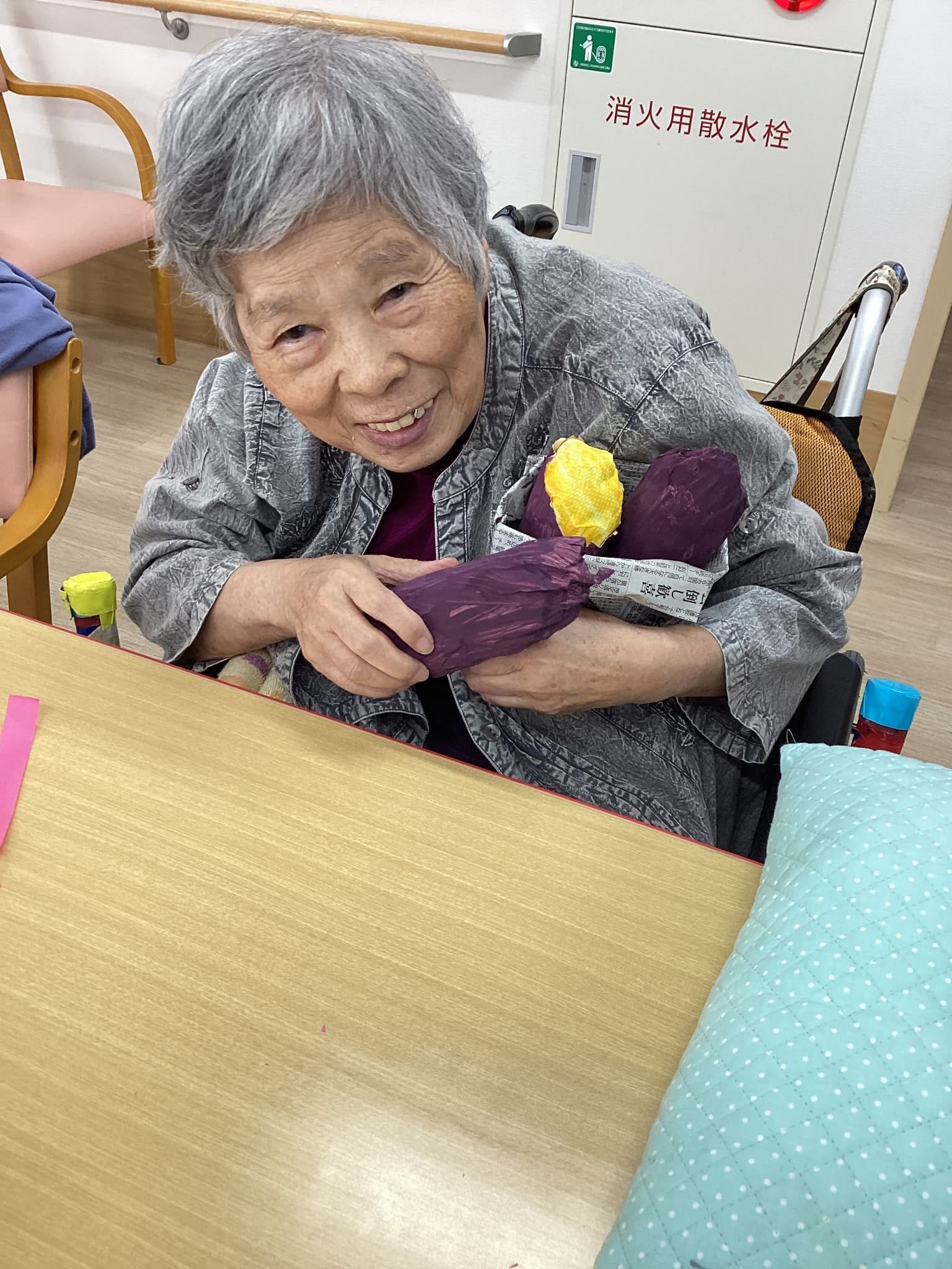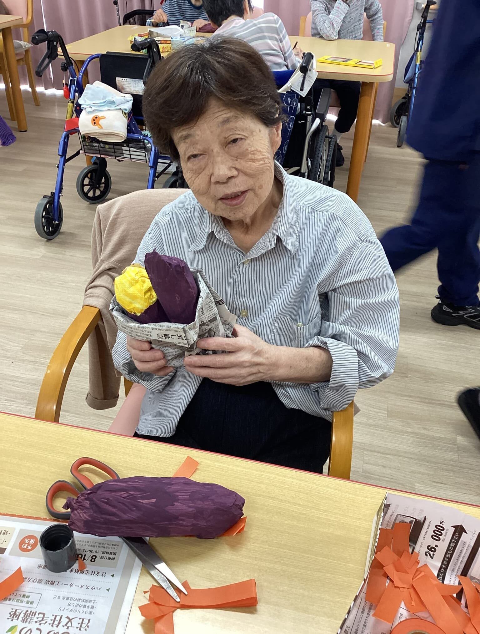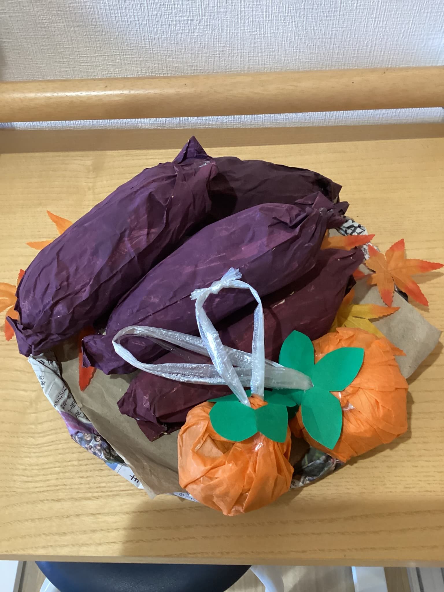 収穫イベントに向けて、利用者がお芋、柿を製作されました。とてもよく出来ており、玄関先にも飾らせて頂いております。