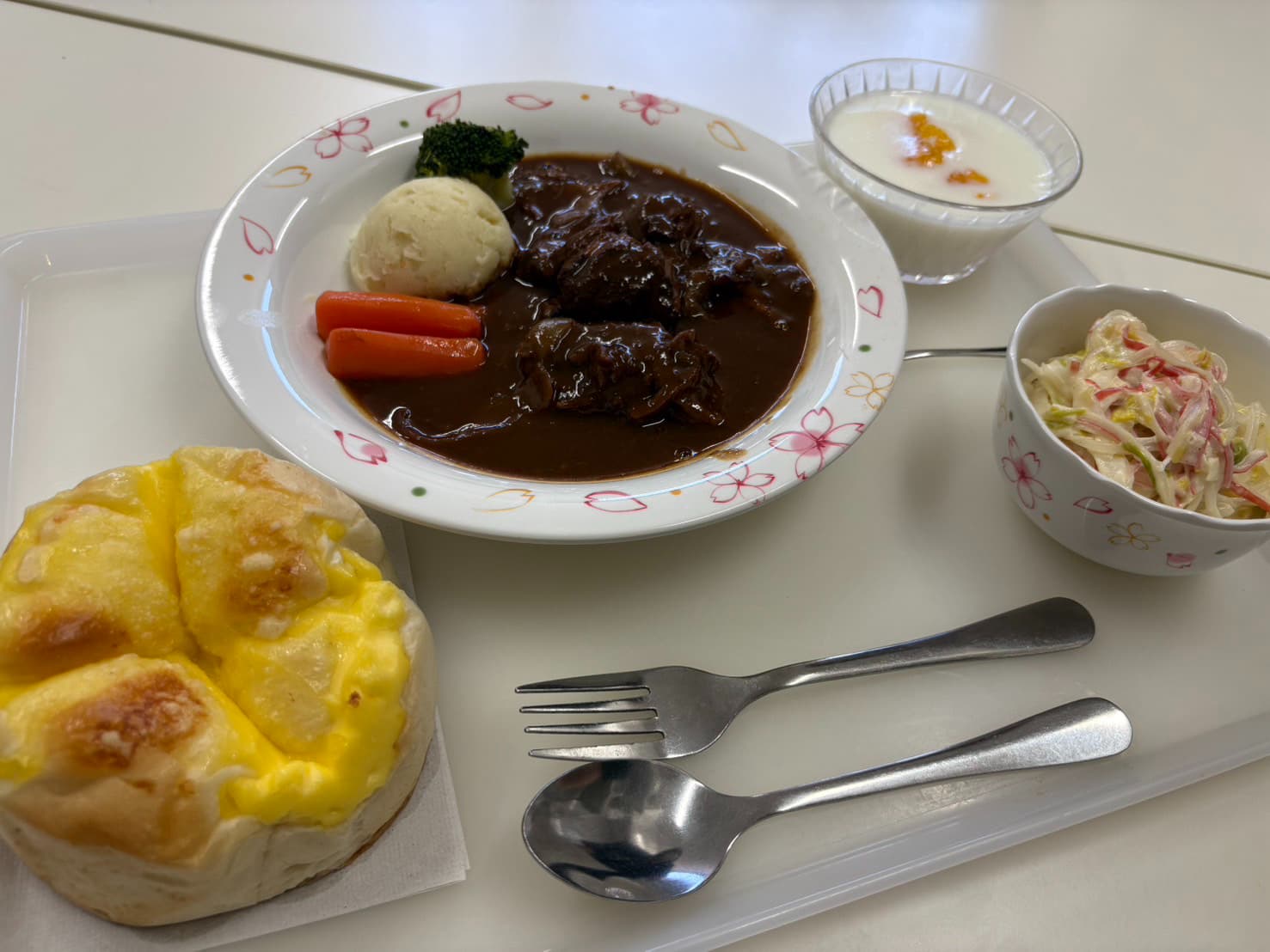 チーズパンにビーフシチュー