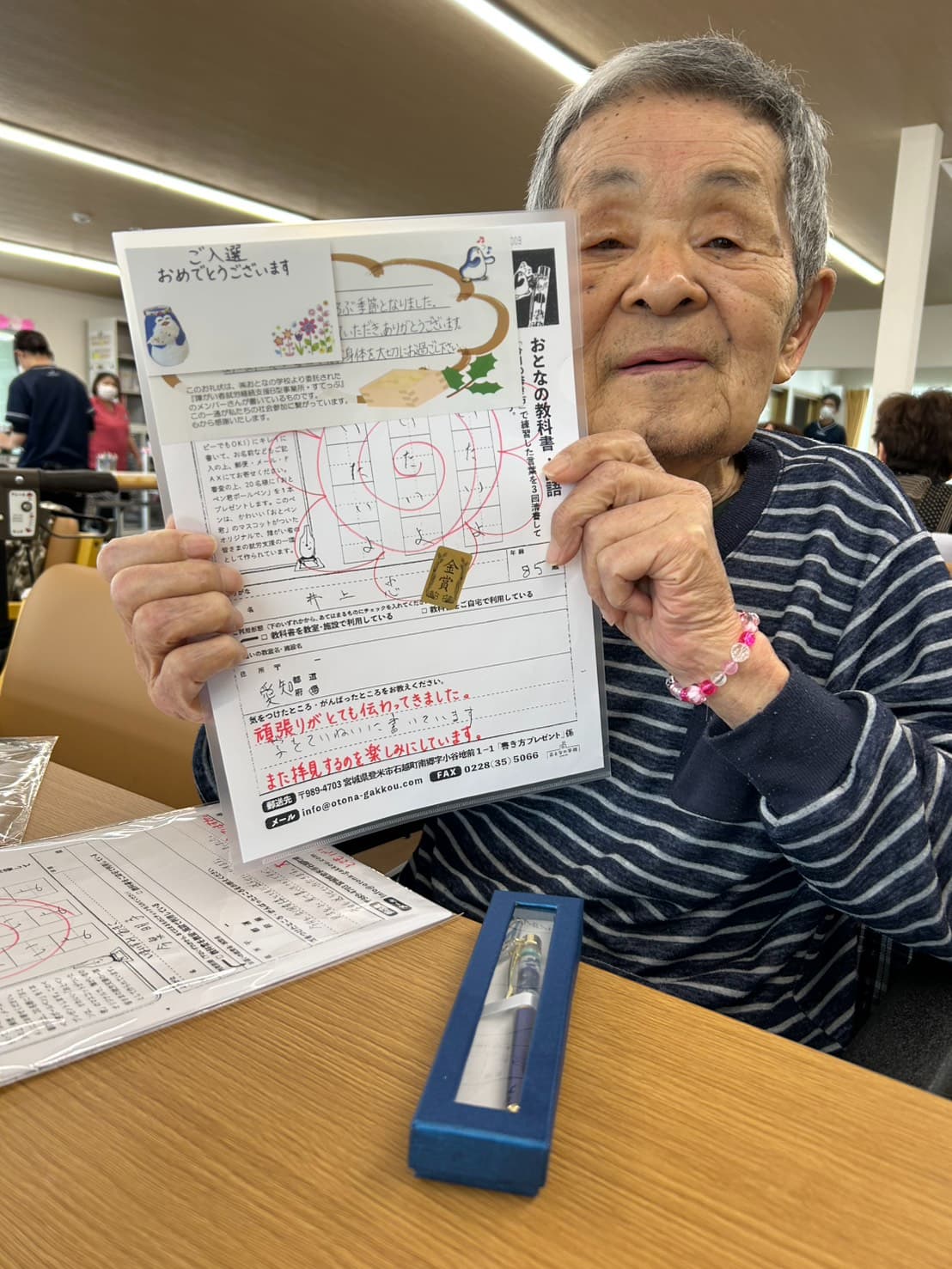 先月、国語「今月の書き方」に応募された2名の方が金賞を受賞し、記念のおとペン君ボールペンをいただきました。