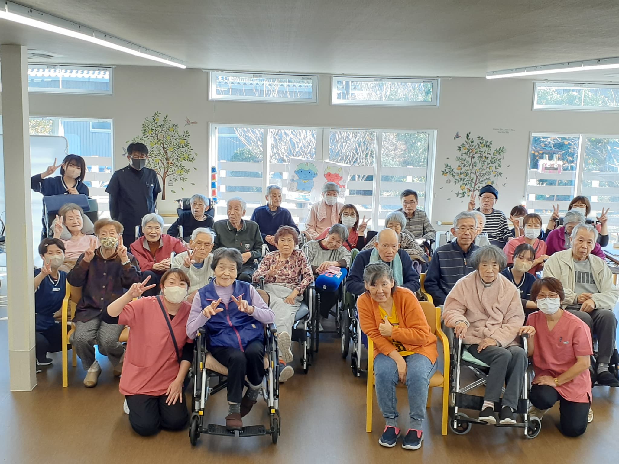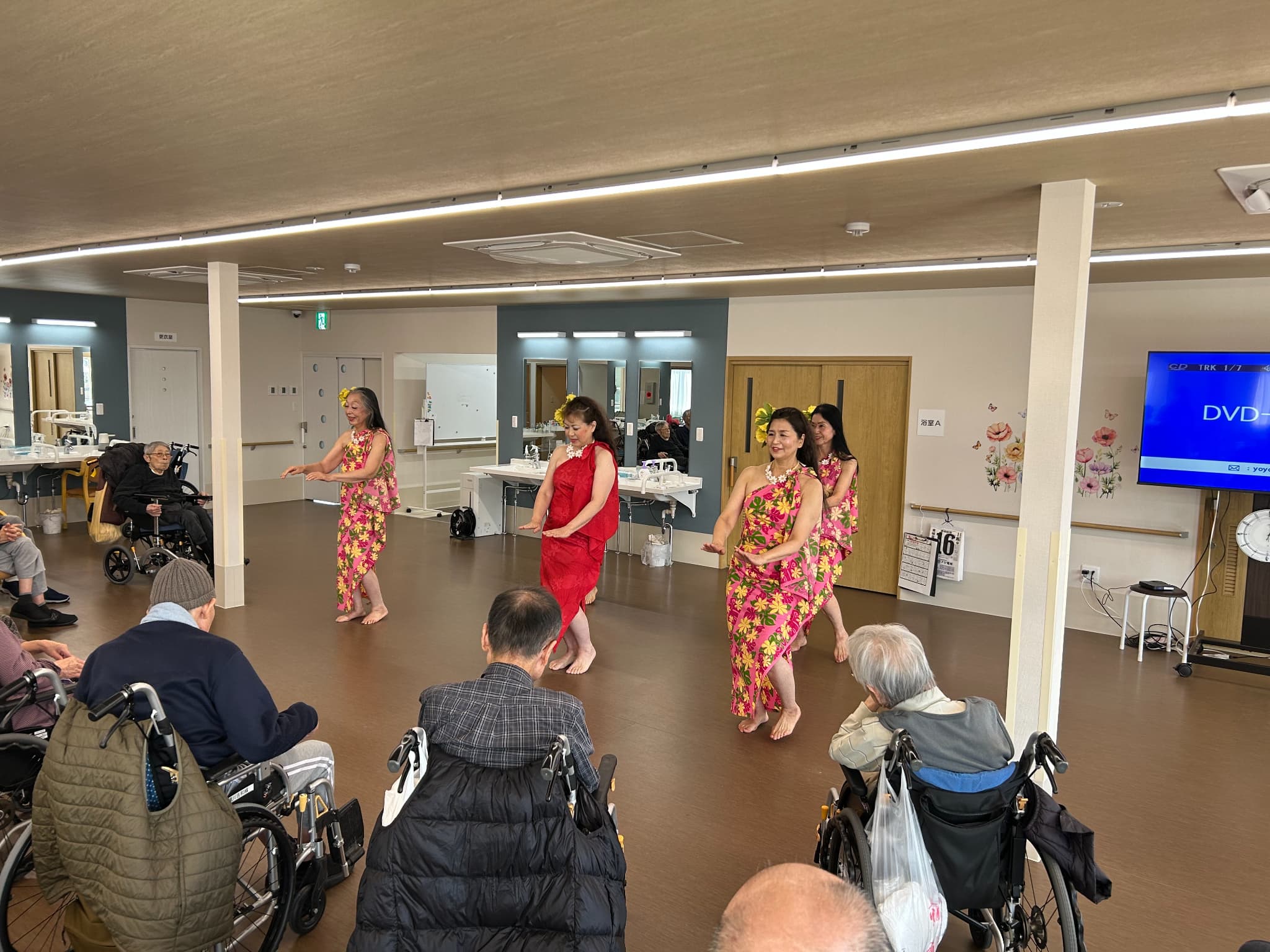デイサービスにフラダンサーの皆様をお呼びしました。ご利用者様は一緒に踊ったり、拍手をしてリズムに乗ったり。スタッフも一緒にとても楽しい時間を過ごせました。