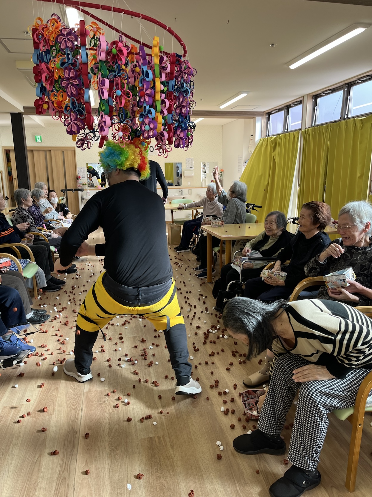 男性職員が鬼に扮して登場すると、力いっぱい豆をぶつける利用者様が多数