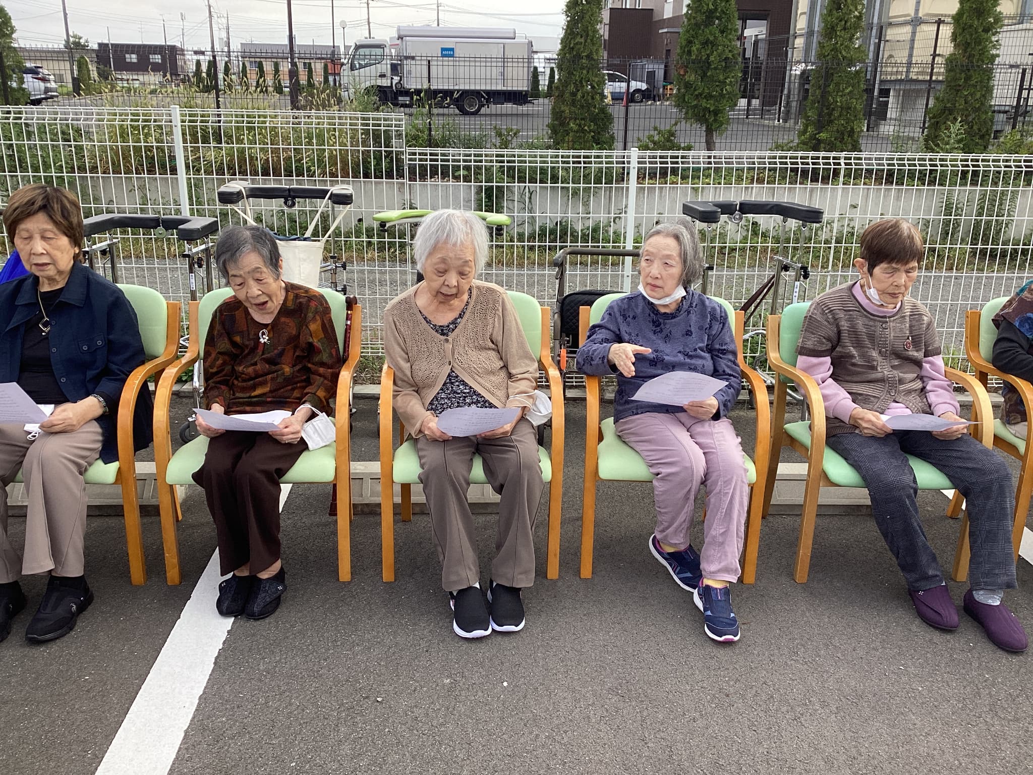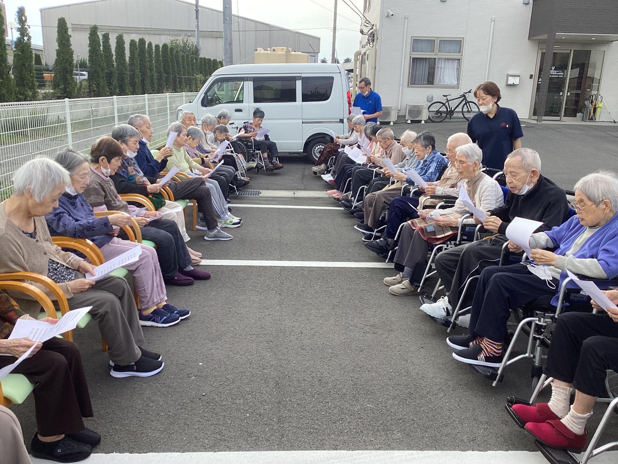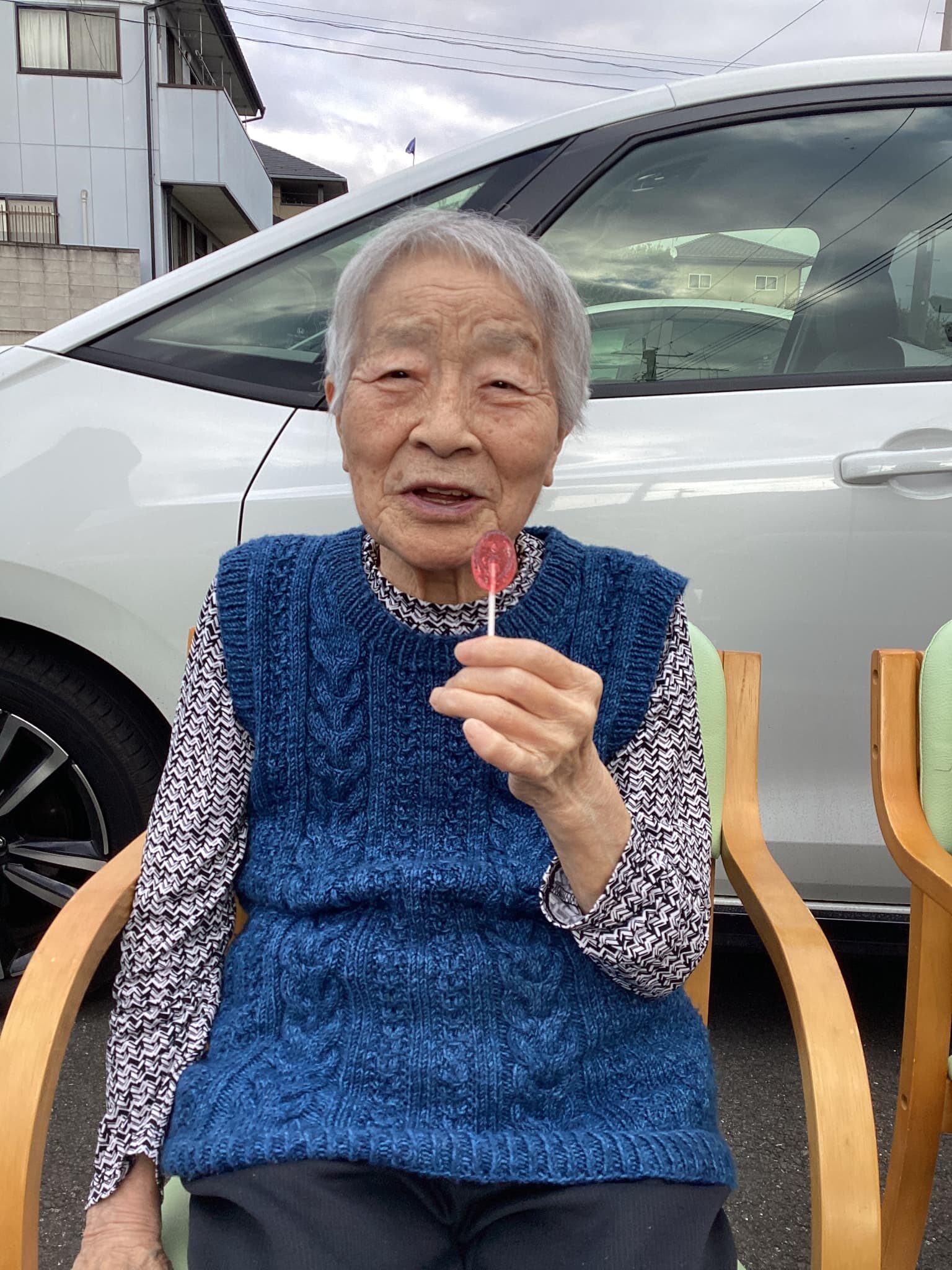 玄関先までお連れする職員1、外に出て駐車場にお連れする職員2、駐車場で見守りをする職員3、イスを外に出す力持ちの職員4は、両手に2個重ねでいっぺんに4個も出してくれました😄