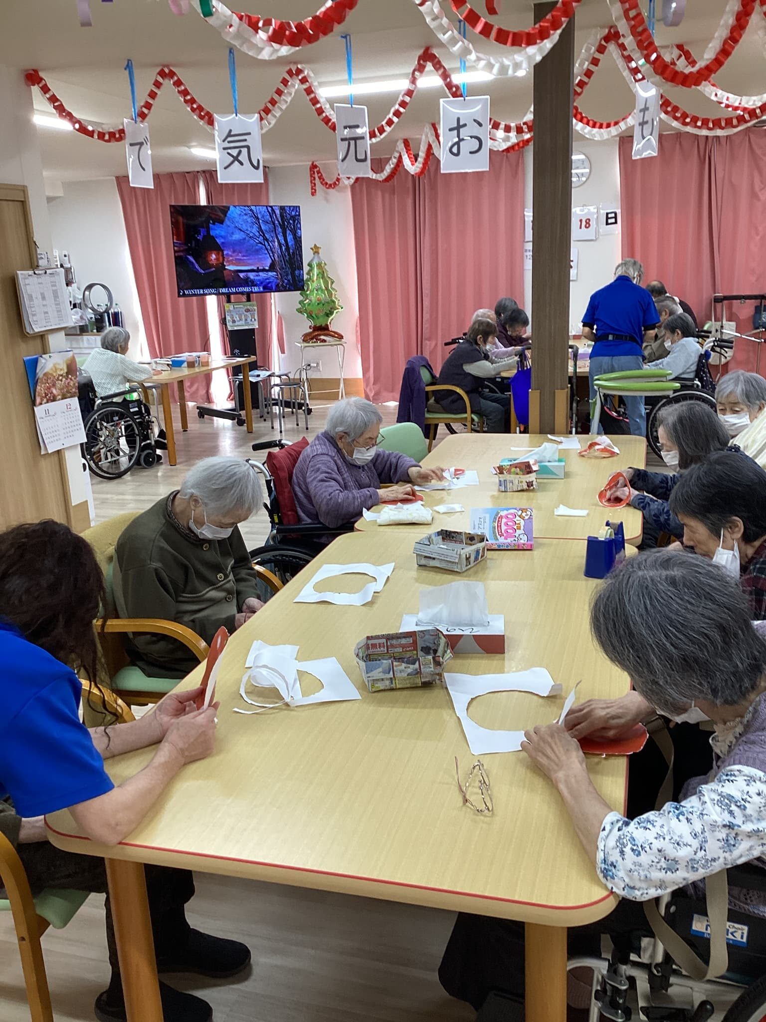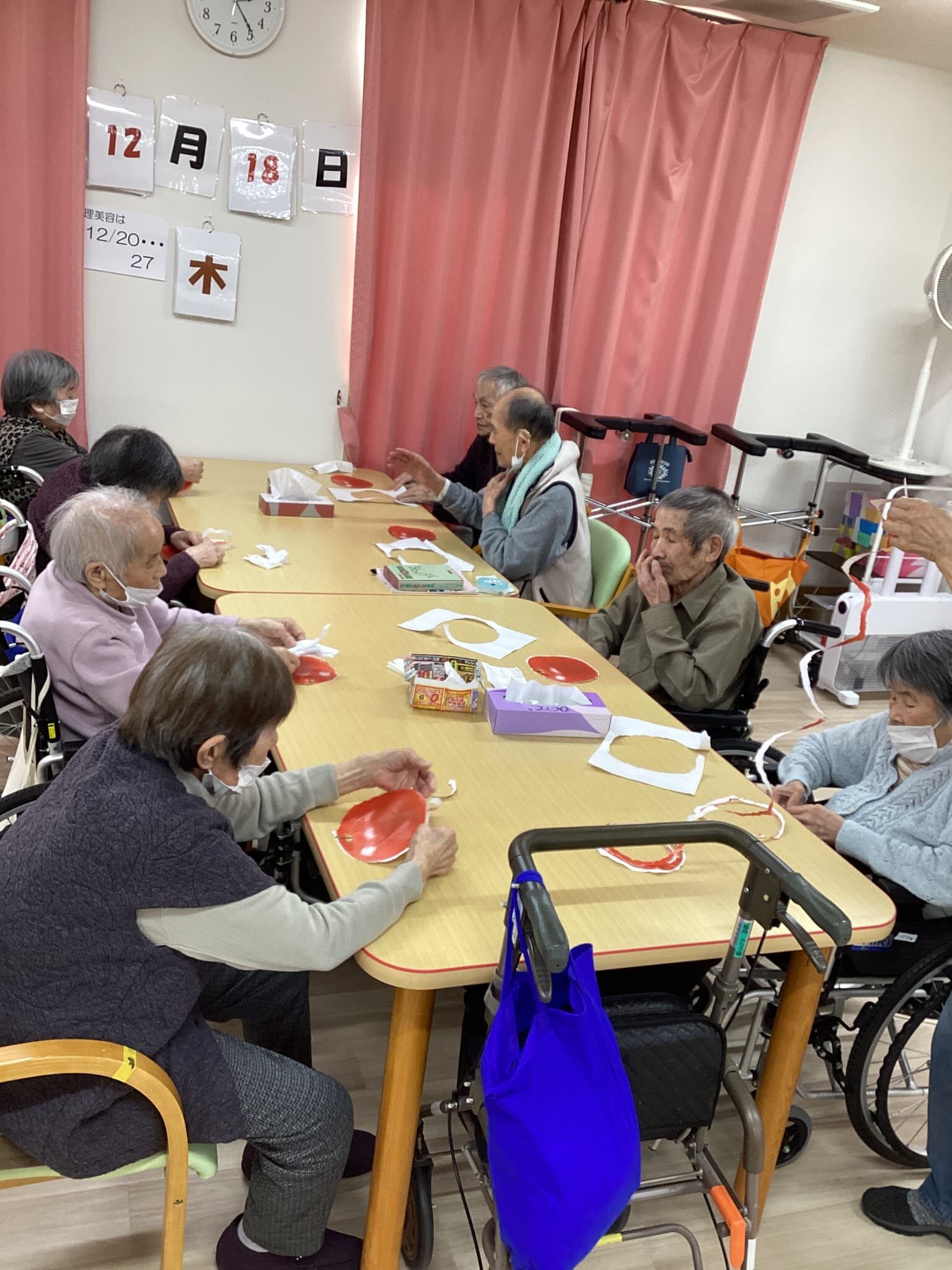最初、太くちぎっていた利用者様が途中で気づいて内緒🤫でまたトライするとなが〜〜〜くちぎることが出来ました。途中でちぎれてしまった利用者様はいがいと少なかったです。皆さま、器用に取り組まれていました。