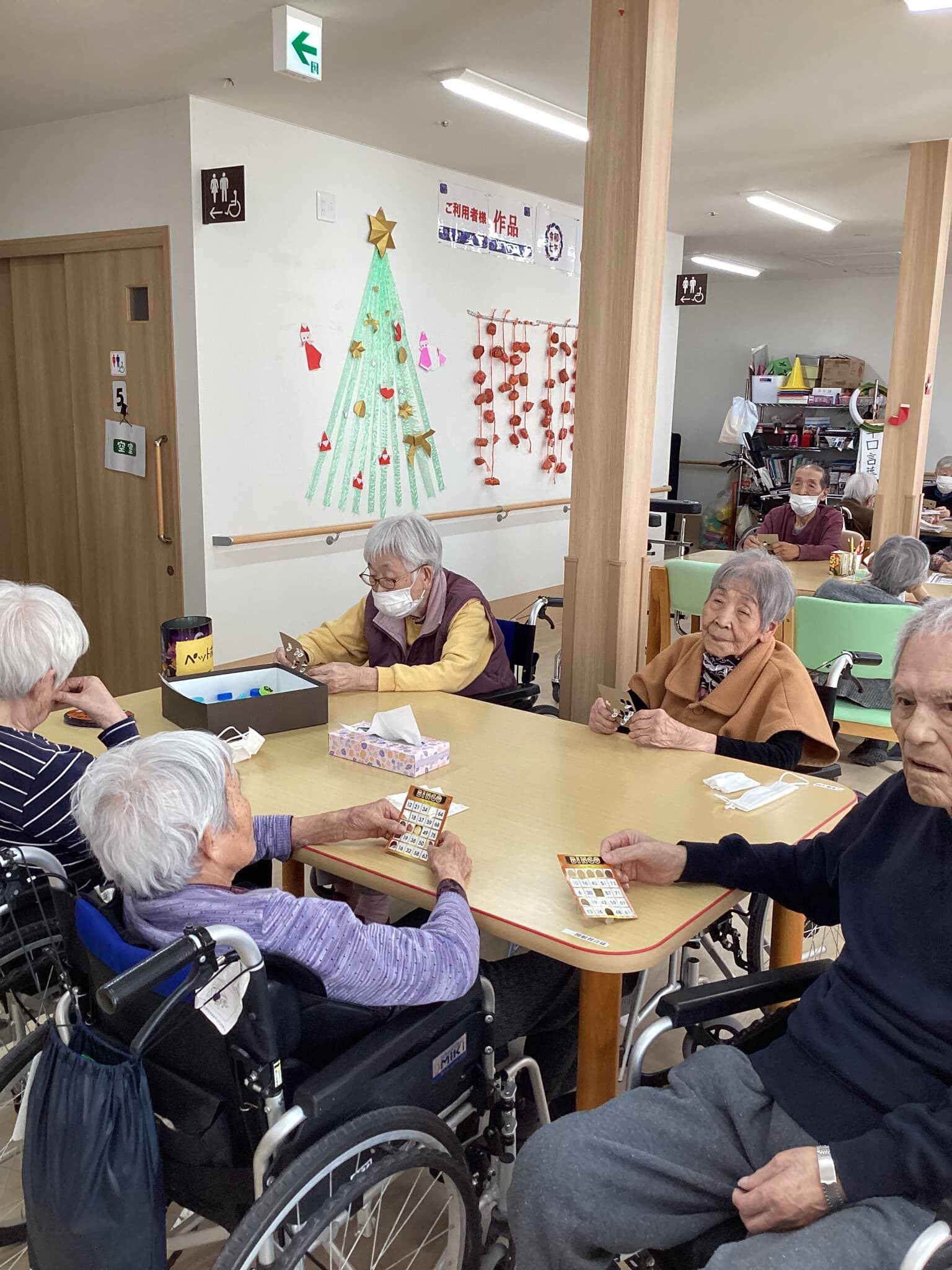 職員の言う数字が合うと一つ々数字をめくり楯、横、斜めどこか一カ所でもそろうとお菓子の景品がもらえるゲームレクを行いました!(^^)!