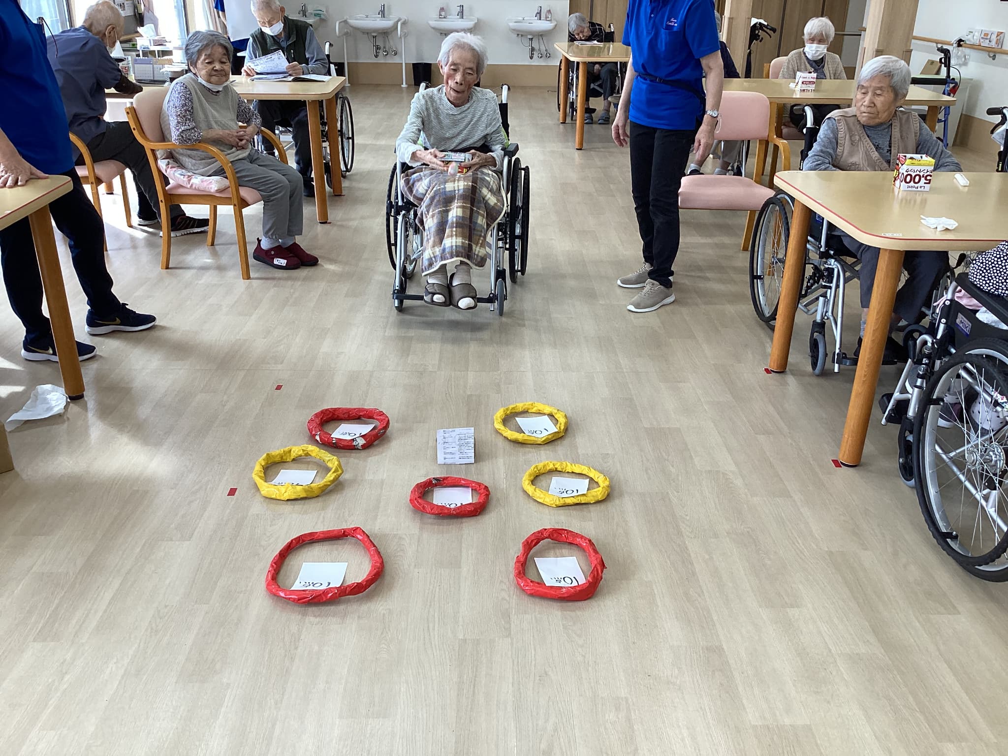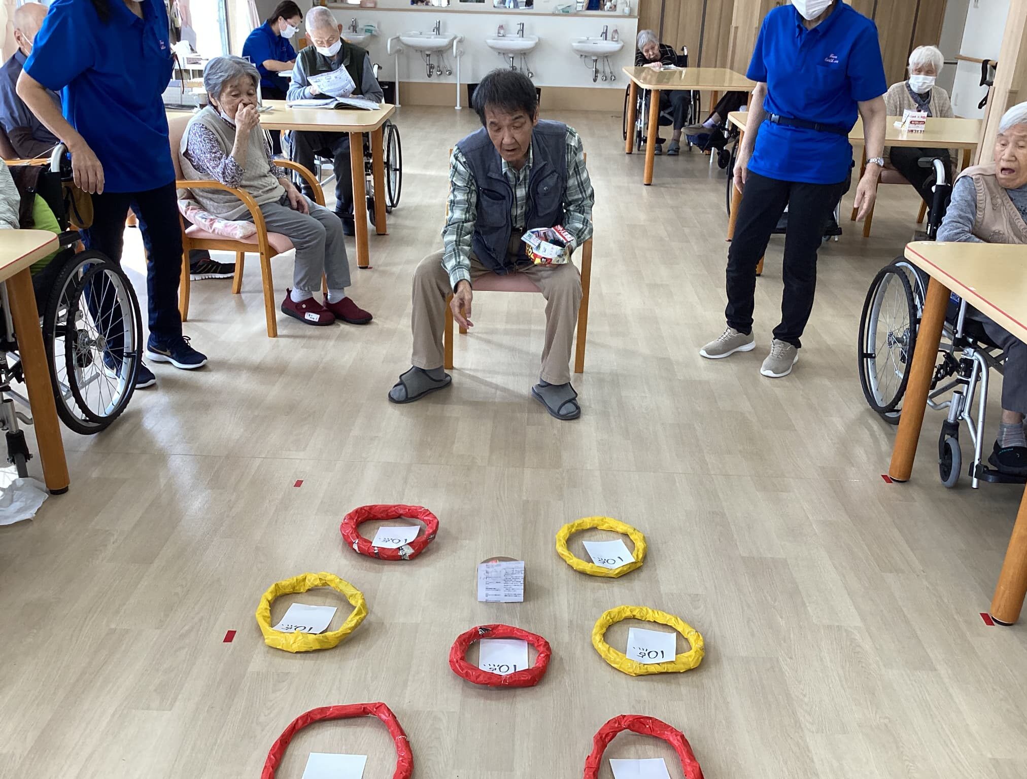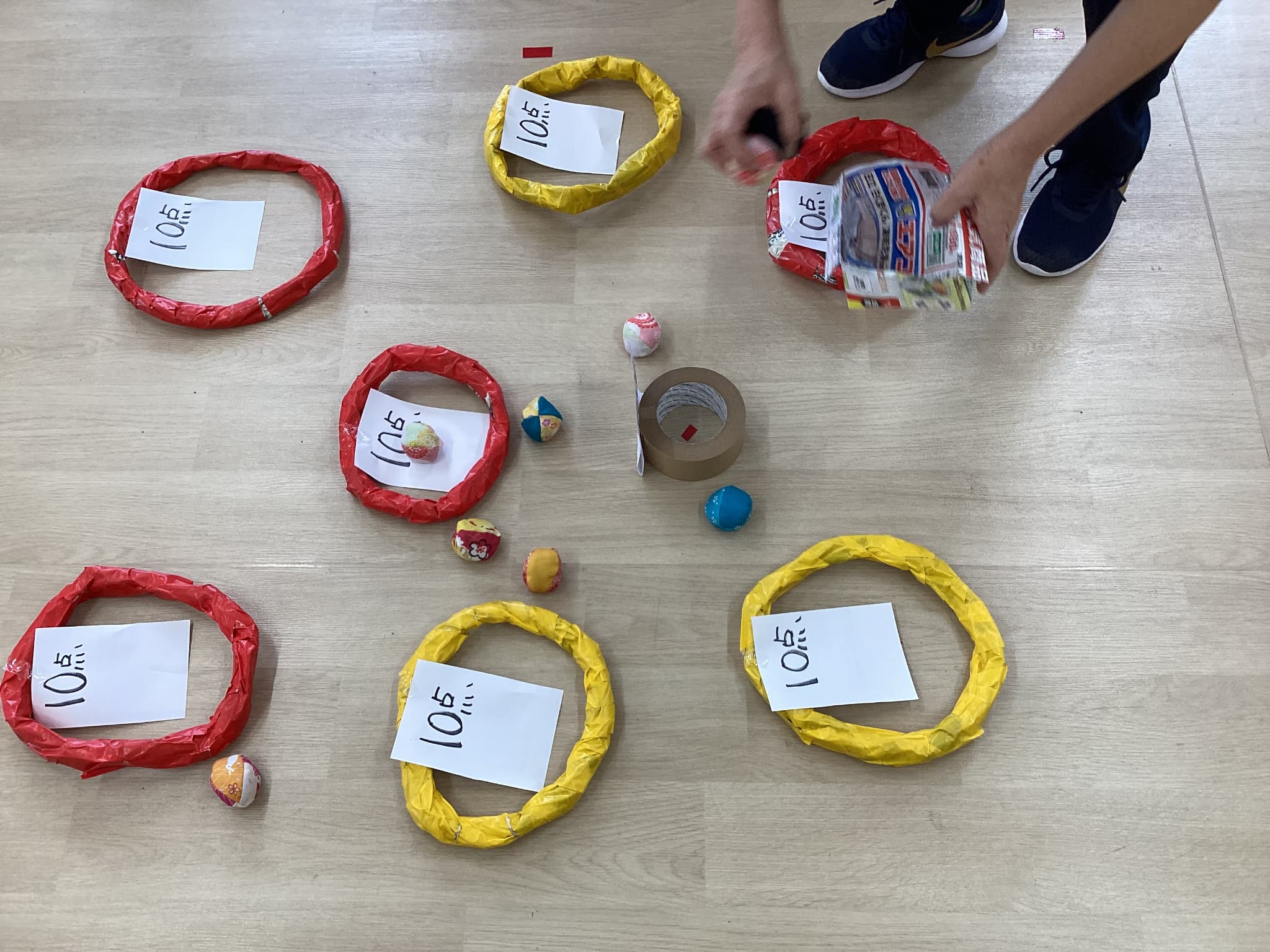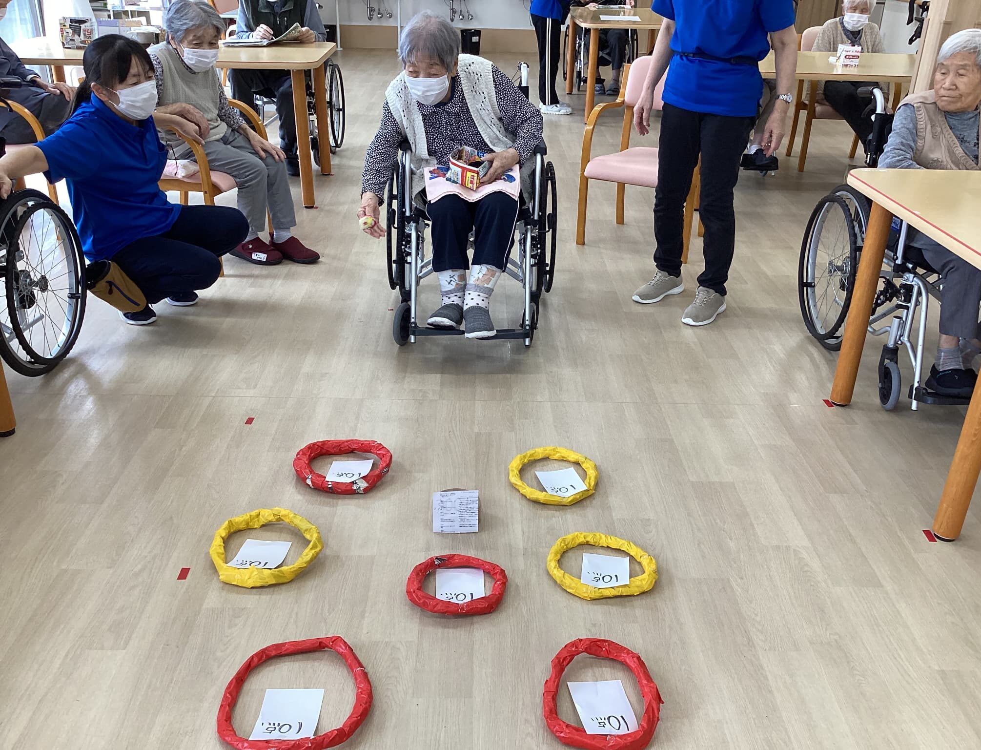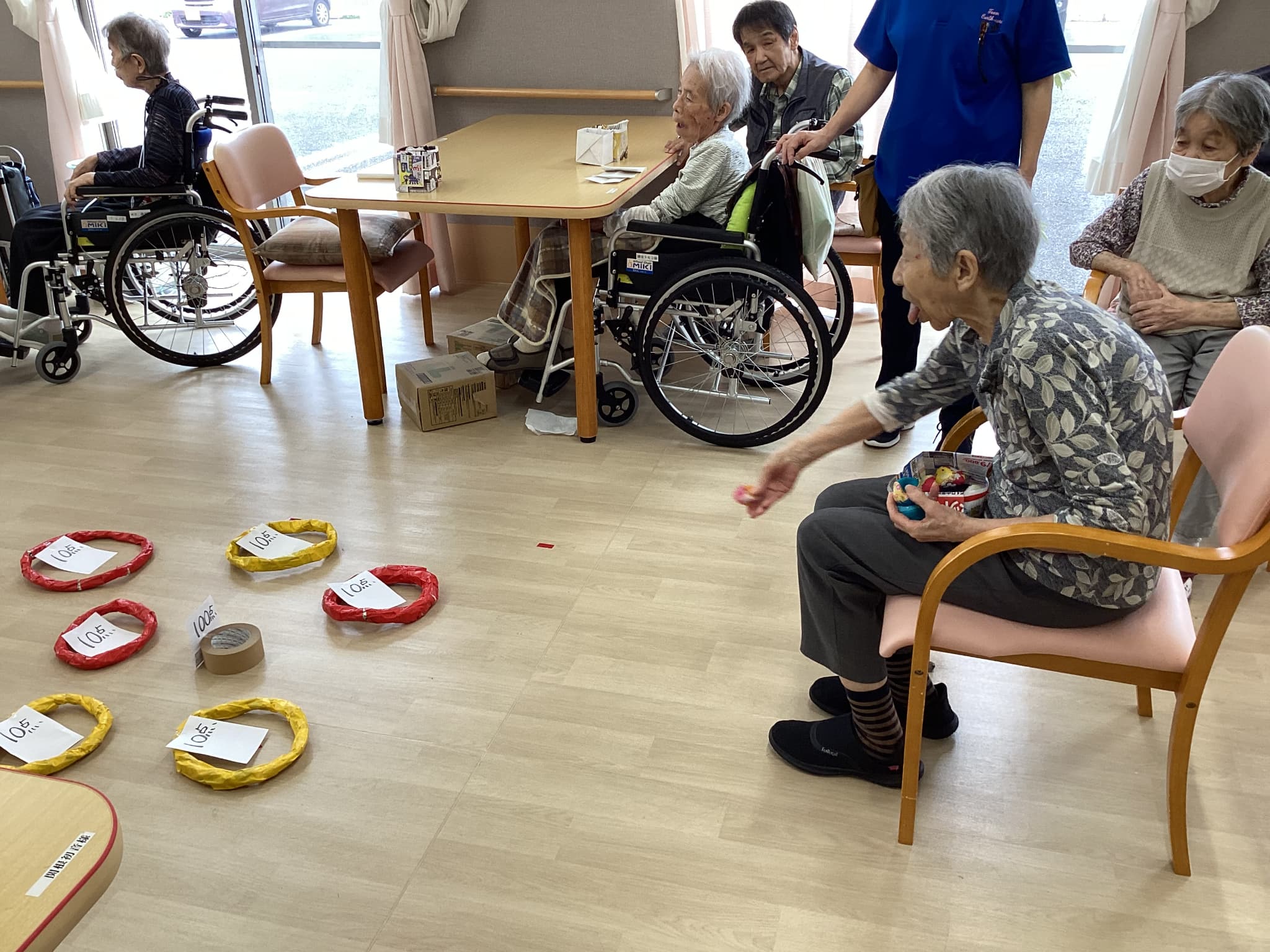 輪っかの中に点数をつけその中へお手玉を一つ々入れ点数取り合戦を行いました(^^)/