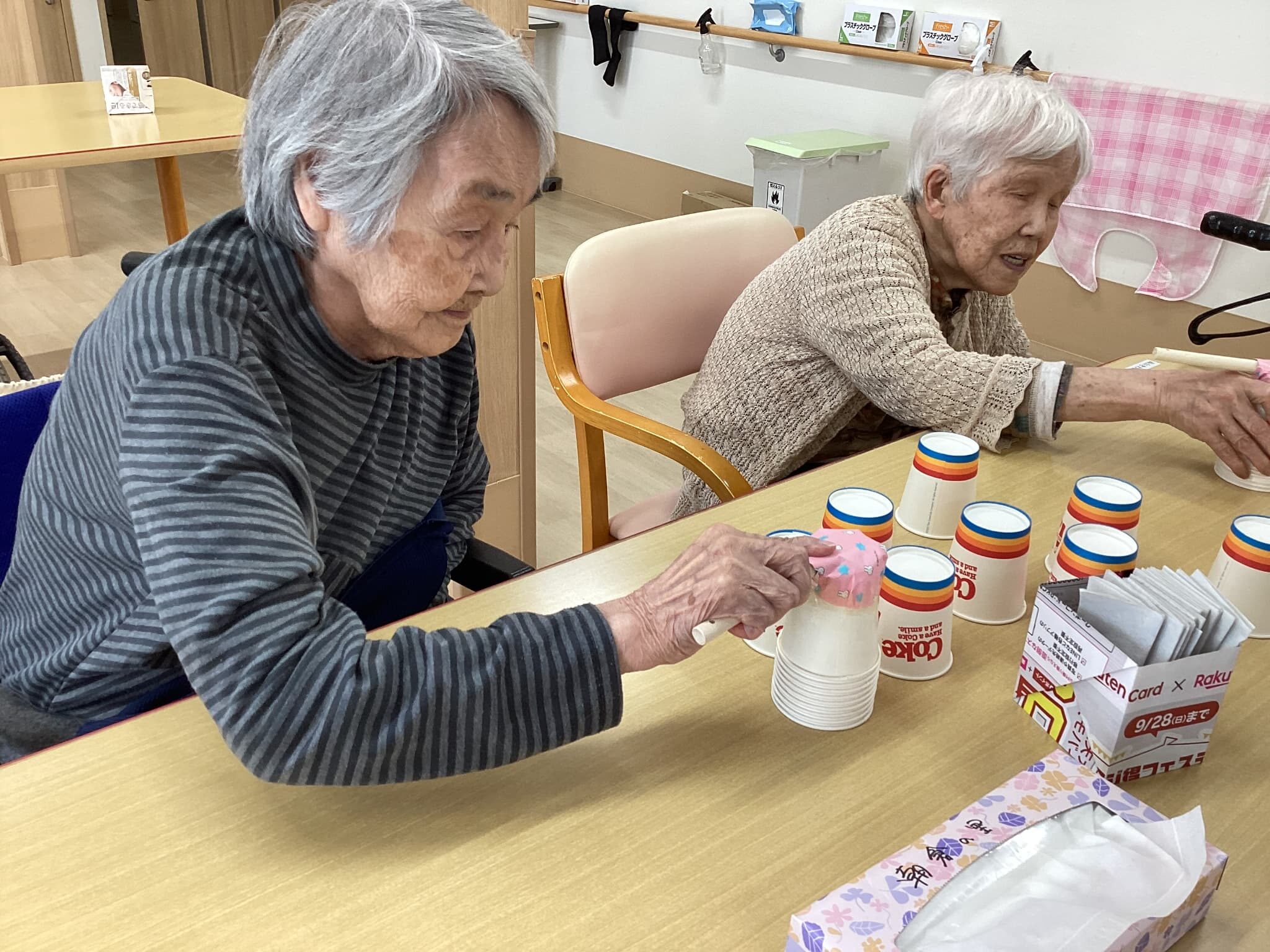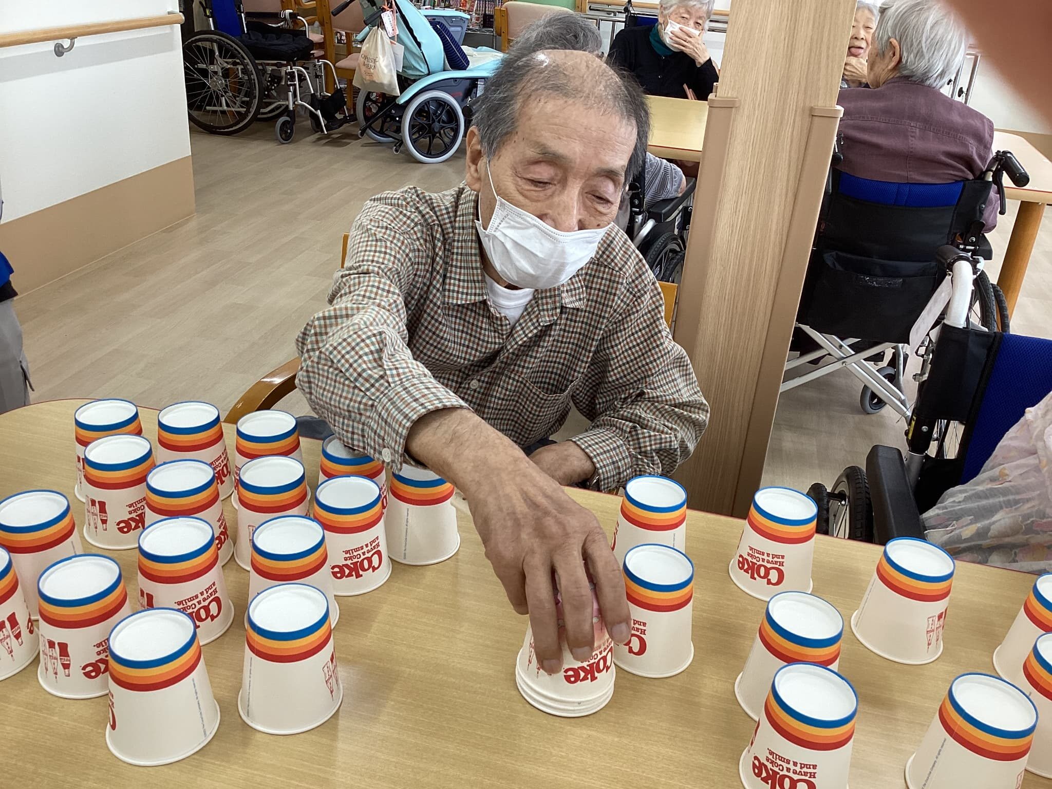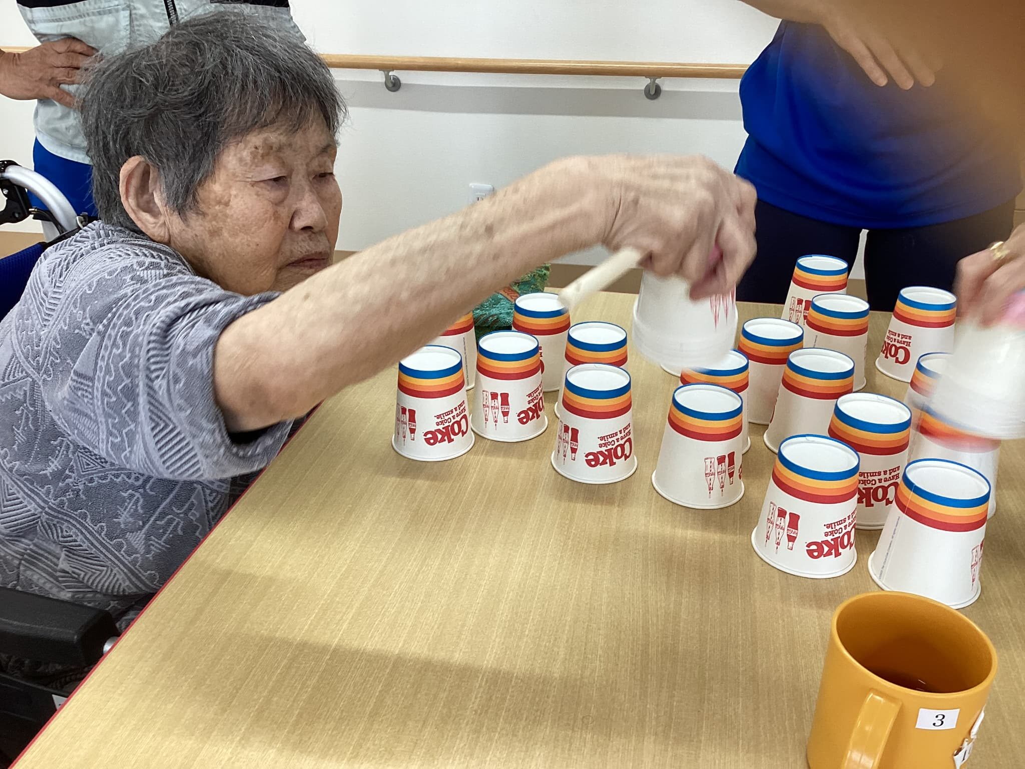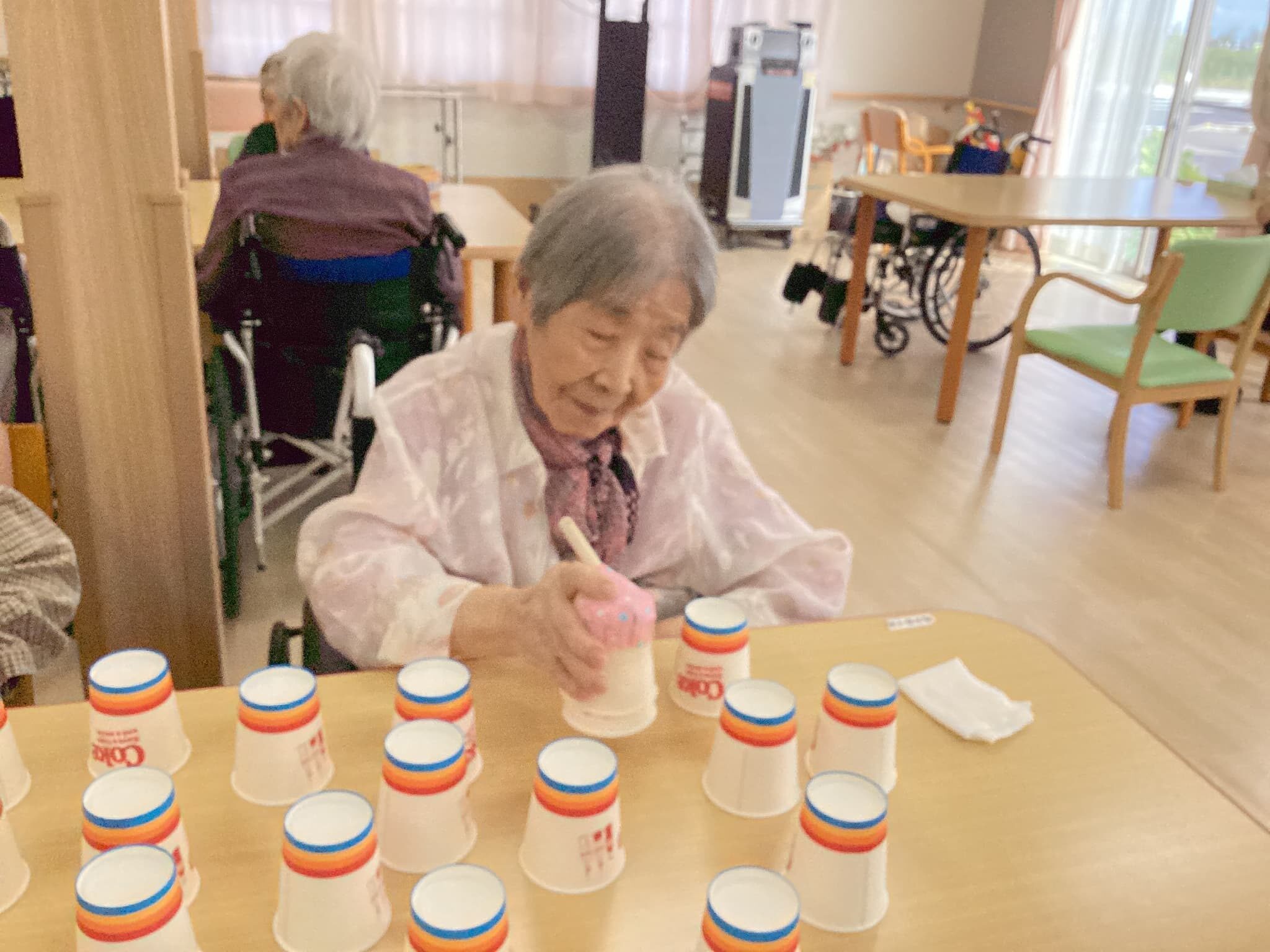 頭を使い皆さん素早い動きで紙コップを取り一つ々重ね競い合いました🎵 楽しい一時でしたね(^^♪